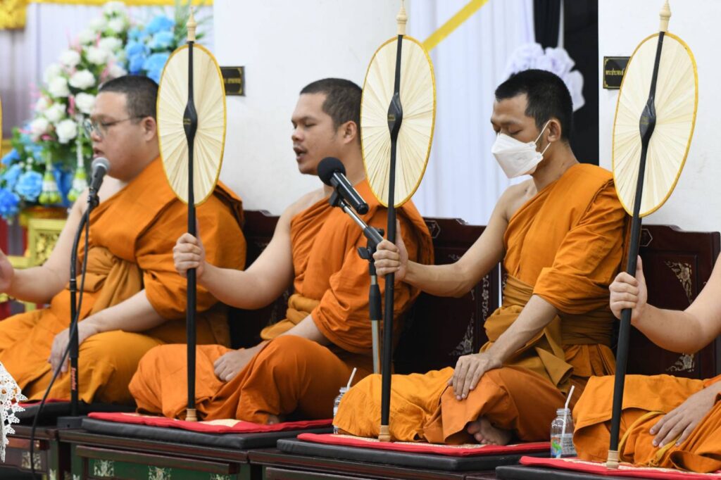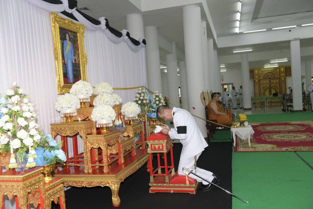 โดยประธานในพิธีจุดธูปเทียนบูชาพระรัตนตรัย จุดธูปเทียนที่เครื่องนมัสการกระบะมุกหน้าตู้พระธรรม และจุดธูปเทียนเครื่องทองน้อยเบื้องหน้าพระฉายาลักษณ์สมเด็จพระนางเจ้าสิริกิติ์ พระบรมราชินีนาถ พระบรมราชชนนีพันปีหลวงจากนั้น คณะสงฆ์ได้สวดพระอภิธรรมทำนองหลวง เพื่ออุทิศถวายเป็นพระราชกุศล ภายหลังการสวดพระอภิธรรมทำนองหลวง ประธานและคณะได้ร่วมถวายไทยธรรม พร้อมทอดผ้าไตรบังสุกุลจำนวน 4 ผืน แด่พระสงฆ์ในการประกอบพิธีบังสุกุล หลังเสร็จสิ้นพิธีกรรมทางสงฆ์ ประธานกรวดน้ำ รับพร ก่อนกราบลาพระรัตนตรัย กราบลาพระสงฆ์และถวายความเคารพพระฉายาลักษณ์สมเด็จพระนางเจ้าสิริกิติ์พระบรมราชินีนาถ พระบรมราชชนนีพันปีหลวงเป็นอันเสร็จพิธี